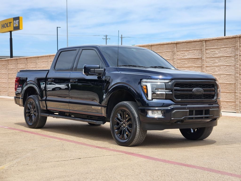 This 2024 Blue Metallic Ford F-150 Lariat 4WD is well equipped and includes these features and benefits: Bed Utility Package (4 Pickup Box Tie-Down Plates, LED Box Lighting, Power Tailgate, and Pro Access Tailgate), Equipment Group 502A High (2nd Row Heated Seats, 6" Extended Chrome Running Boards, Heads-Up Display, and Radio: B&O Unleashed Sound System by Bang & Olufsen), Mobile Office Package (Console Worksurface, Partitioned Lockable Rear Storage, and Wireless Charging), Tow/Haul Package, 3.5L PowerBoost Full-Hybrid V6, 4WD, 4-Wheel Disc Brakes, 6" Extended Running Boards, 8 Speakers, ABS brakes, Adjustable pedals, Air Conditioning, Alloy wheels, AM/FM radio: SiriusXM with 360L, Auto High-beam Headlights, Auto-dimming door mirrors, Auto-dimming Rear-View mirror, Automatic temperature control, Brake assist, Bumpers: chrome, Chrome wheels, Compass, Delay-off headlights, Driver door bin, Driver vanity mirror, Dual front impact airbags, Dual front side impact airbags, Electronic Stability Control, Emergency communication system: SYNC 4 911 Assist, Front anti-roll bar, Front Bucket Seats, Front Center Armrest, Front dual zone A/C, Front fog lights, Front reading lights, Front wheel independent suspension, Fully automatic headlights, Garage door transmitter, Heated door mirrors, Heated front seats, Heated steering wheel, Illuminated entry, Leather-Trimmed Bucket Seats, Low tire pressure warning, Memory seat, Navigation system: Connected Navigation, Occupant sensing airbag, On-Board Scales w/Smart Hitch, Outside temperature display, Overhead airbag, Overhead console, Panic alarm, Passenger door bin, Passenger vanity mirror, Pedal memory, Power door mirrors, Power driver seat, Power passenger seat, Power steering, Power windows, Pro Access Tailgate Removal (DISC), Pro Power Onboard - 7.2KW, Radio data system, Radio: B&O Sound System by Bang & Olufsen, Rain sensing wipers, Rear reading lights, Rear seat center armrest, Rear step bumper, Rear window defroster, Remote keyless entry, Security system, Speed control, Split folding rear seat, Steering wheel mounted audio controls, SYNC 4 w/Enhanced Voice Recognition, Tachometer, Telescoping steering wheel, Tilt steering wheel, Tough Bed Spray-In Bedliner, Traction control, Trip computer, Turn signal indicator mirrors, Twin Panel Moonroof, Variably intermittent wipers, Ventilated front seats, Voltmeter, and Wheels: 20" Chrome-Like PVD. 3.5L PowerBoost Full-Hybrid V6, 4WD. CARFAX One-Owner. Dallas Fort Worth Arlington Carrollton Irving Hurst Euless Bedford Farmers Branch Denton Mansfield Garland Mesquite Richardson Burleson.
