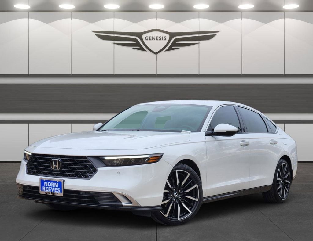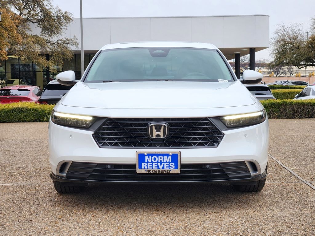 This 2024 Platinum White Pearl Honda Accord Hybrid Touring FWD is well equipped and includes these features and benefits: Accord Hybrid Touring, 2.0L 16V DOHC, eCVT, Black Leather, 12 Speakers, 4-Wheel Disc Brakes, ABS brakes, Adaptive Cruise Control: Adaptive Cruise Control (ACC) with Low-Speed Follow, Adaptive suspension, Air Conditioning, Alloy wheels, AM/FM radio, Apple CarPlay/Android Auto, Auto High-beam Headlights, Auto-dimming Rear-View mirror, Automatic temperature control, Blind Spot Information (BSI) System warning, Bose Premium Sound System, Brake assist, Bumpers: body-color, Compass, Delay-off headlights, Driver door bin, Driver vanity mirror, Dual front impact airbags, Dual front side impact airbags, Electronic Stability Control, Emergency communication system: HondaLink, Exterior Parking Camera Rear, Four wheel independent suspension, Front anti-roll bar, Front Bucket Seats, Front Center Armrest, Front dual zone A/C, Front reading lights, Fully automatic headlights, Heads-Up Display, Heated & Ventilated Front Bucket Seats, Heated door mirrors, Heated front seats, Heated rear seats, Illuminated entry, Knee airbag, Lane departure: Lane Keeping Assist System (LKAS) active, Leather Shift Knob, Leather steering wheel, Leather-Trimmed Seat Trim, Low tire pressure warning, Memory seat, Navigation System, Occupant sensing airbag, Outside temperature display, Overhead airbag, Overhead console, Panic alarm, Passenger door bin, Passenger vanity mirror, Power door mirrors, Power driver seat, Power moonroof, Power passenger seat, Power steering, Power windows, Radio data system, Rain sensing wipers, Rear anti-roll bar, Rear reading lights, Rear seat center armrest, Rear side impact airbag, Rear window defroster, Remote keyless entry, Security system, Speed control, Speed-sensing steering, Speed-Sensitive Wipers, Split folding rear seat, Steering wheel mounted audio controls, Telescoping steering wheel, Tilt steering wheel, Traction control, Trip computer, Turn signal indicator mirrors, Variably intermittent wipers, Ventilated front seats, and Wheels: 19" x 8.5J Berlina Black. Accord Hybrid Touring, 2.0L 16V DOHC, eCVT, Black Leather.