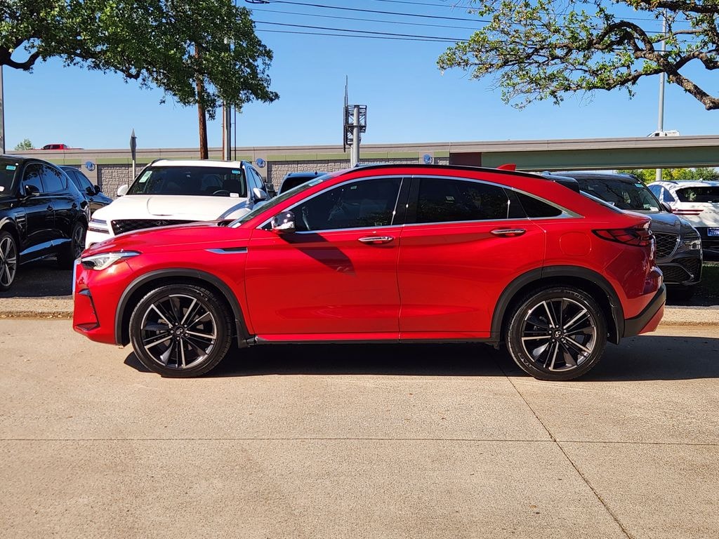 This 2022 Dynamic Sunstone Red INFINITI QX55 SENSORY AWD is well equipped and includes these features and benefits: Lighting Package (Illuminated Kick Plates and Welcome Lighting), QX55 SENSORY, AWD, Dynamic Sunstone Red, Graphite Leather, 16 Speakers, Heads-Up Display, Memory seat, Navigation system: INFINITI InTouch Navigation, Power Liftgate, Power moonroof, 4-Wheel Disc Brakes, 5.846 Axle Ratio, ABS brakes, Air Conditioning, Alloy wheels, AM/FM radio: SiriusXM, Auto High-beam Headlights, Auto tilt-away steering wheel, Auto-dimming Rear-View mirror, Automatic temperature control, Black Splash Guards (Set of 4), Brake assist, Bumpers: body-color, Carpeted Floor Mats, CD player, Climate Controlled Front Bucket Seats, Delay-off headlights, Driver door bin, Driver vanity mirror, Dual front impact airbags, Dual front side impact airbags, Electronic Stability Control, Emergency communication system: INFINITI InTouch, Exclusive Paint, Four wheel independent suspension, Front anti-roll bar, Front Bucket Seats, Front Center Armrest, Front dual zone A/C, Front fog lights, Front reading lights, Garage door transmitter: HomeLink, Genuine wood door panel insert, Heated door mirrors, Heated front seats, Heated steering wheel, Illuminated entry, Knee airbag, Leather Shift Knob, Low tire pressure warning, Occupant sensing airbag, Outside temperature display, Overhead airbag, Overhead console, Panic alarm, Passenger door bin, Passenger vanity mirror, Power door mirrors, Power driver seat, Power passenger seat, Power steering, Power windows, Radio data system, Radio: Bose Performance Series Premium Audio, Rain sensing wipers, Rear air conditioning, Rear anti-roll bar, Rear reading lights, Rear seat center armrest, Rear window defroster, Rear window wiper, Remote keyless entry, Security system, Semi-Aniline Leather-Appointed Seat Trim, Speed control, Speed-sensing steering, Speed-Sensitive Wipers, Split folding rear seat, Spoiler, Steering wheel memory, Steering wheel mounted audio controls, Tachometer, Telescoping steering wheel, Tilt steering wheel, Traction control, Trip computer, Turn signal indicator mirrors, Variably intermittent wipers, Ventilated front seats, and Wheels: 20" x 8.5" Machine Finish Aluminum Alloy. QX55 SENSORY, AWD, Dynamic Sunstone Red, Graphite Leather, 16 Speakers, Heads-Up Display, Illuminated Kick Plates, Lighting Package, Memory seat, Navigation system: INFINITI InTouch Navigation, Power Liftgate, Power moonroof, Welcome Lighting.