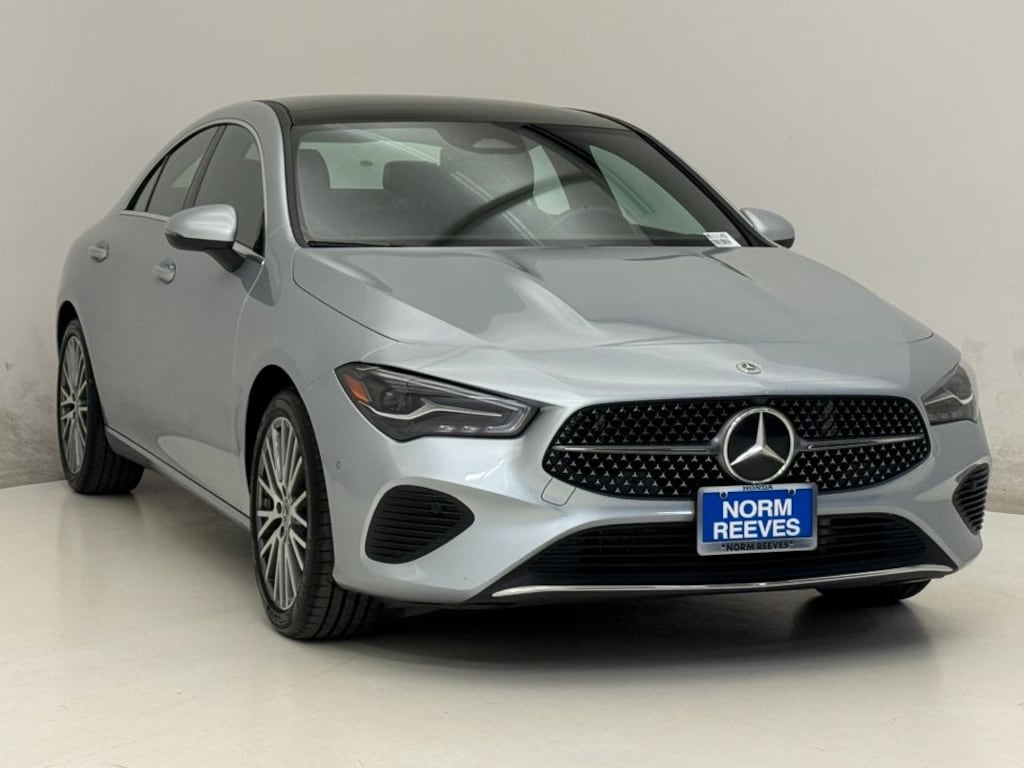 This 2025 Silver Mercedes-Benz CLA 250 AWD is well equipped and includes these features and benefits: 18" Multi-Spoke Alloy Wheels, 4-Wheel Disc Brakes, 8 Speakers, ABS brakes, Air Conditioning, Alloy wheels, AM/FM radio: SiriusXM, Apple CarPlay®/Android Auto®, Auto High-beam Headlights, Auto-dimming Rear-View mirror, Automatic temperature control, Brake assist, Brushed Aluminum Interior Trim, Bumpers: body-color, Child-Seat-Sensing Airbag, Delay-off headlights, Driver door bin, Driver vanity mirror, Dual front impact airbags, Dual front side impact airbags, Electronic Stability Control, Emergency communication system: eCall Emergency System, Exterior Parking Camera Rear, Four wheel independent suspension, Front anti-roll bar, Front Bucket Seats, Front Center Armrest, Front dual zone A/C, Front reading lights, Fully automatic headlights, Garage door transmitter, Heated door mirrors, Illuminated entry, Knee airbag, Leather steering wheel, Low tire pressure warning, MB-Tex Upholstery, Memory seat, Occupant sensing airbag, Outside temperature display, Overhead airbag, Overhead console, Panic alarm, Passenger door bin, Passenger vanity mirror, Power door mirrors, Power driver seat, Power moonroof, Power passenger seat, Power steering, Power windows, Radio data system, Radio: MBUX Multimedia System, Rain sensing wipers, Rear anti-roll bar, Rear fog lights, Rear reading lights, Rear seat center armrest, Rear window defroster, Remote keyless entry, Security system, SiriusXM Satellite Radio, Speed control, Speed-sensing steering, Split folding rear seat, Steering wheel mounted audio controls, Tachometer, Telescoping steering wheel, Tilt steering wheel, Traction control, Trip computer, Turn signal indicator mirrors, and Variably intermittent wipers.